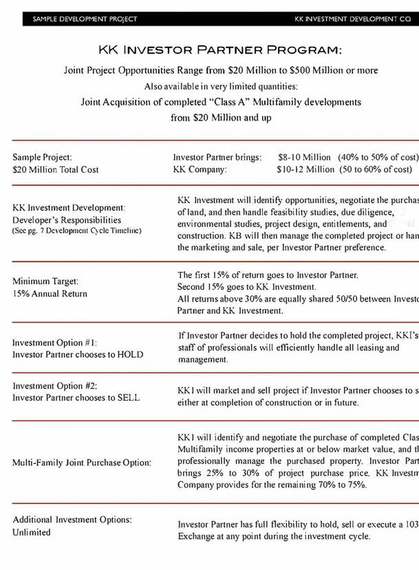 The traditional structure for joint venture developments involves a capital investment of 35-45% of the total project cost by the equity partner. KK Investment’s responsibility is to obtain a loan for the best terms for 55-65% of the total project cost. Our company brings its excellent track record and credibility with the financial entity to the table. Another option is for the investor to provide construction financing and enjoy a preferred return on such funds before the profit participation. As general partner, KK Investment guides the project through the stages of development and management functions, as detailed in the table on the previous page.